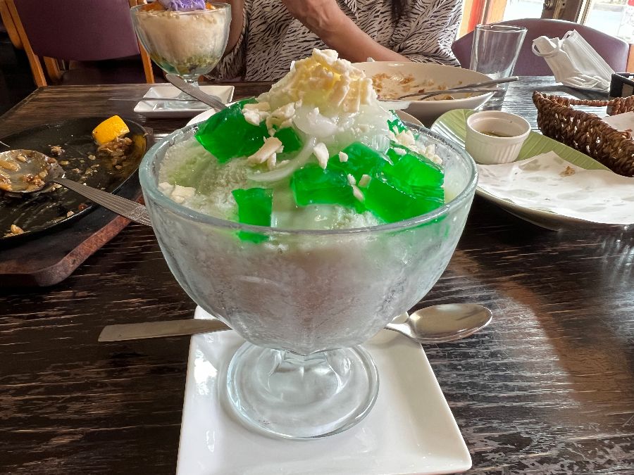 식사를 마칠 때쯤, 혀끝에 감도는 달콤한 유혹을 떨칠 수 없어 디저트를 주문했습니다. 필리핀의 대표적인 디저트인 ‘할로할로’는 얼음, 연유, 젤리, 과일, 아이스크림 등이 어우러져 시원하고 다채로운 맛을 선사했습니다. 초록색 젤리가 빛나는 모습은 시각적으로도 즐거움을 주었죠. 또 다른 디저트로는 몽환적인 보랏빛이 아름다운 우베 케이크를 맛보았습니다. 부드럽고 달콤한 우베 특유의 풍미는 식사의 완벽한 마무리가 되어주었습니다.