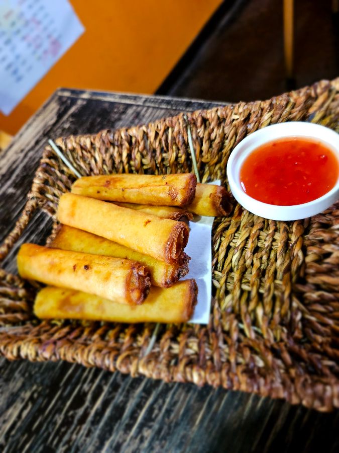 다음으로 맛본 것은 필리핀 요리의 꽃이라 불리는 ‘포크 어도보’와 탱글한 면이 인상적인 ‘팬싯’, 그리고 바삭하게 튀겨진 ‘룸피아’였습니다. 포크 어도보는 라후테와 비슷한 결을 가지면서도 특유의 신맛과 향신료가 조화롭게 어우러져 깊은 맛을 냈고, 삶은 달걀과 함께 부드러운 고기는 밥도둑이 따로 없었습니다. 팬싯은 첫 입을 베어 물었을 때의 감탄이 우연이 아니었음을 몇 번이고 확인시켜 줄 정도로 맛있었고, 믹스 타입이라 봄비와 메밀 면의 식감을 동시에 즐길 수 있어 좋았습니다. 룸피아는 비록 평범해 보였지만, 한 입 베어 물자 아삭한 소리와 함께 속을 채운 촉촉한 치킨이 만족감을 주었습니다.