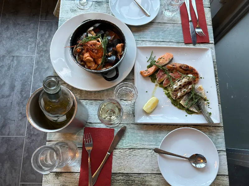 플래터는 그야말로 ‘만찬’이라는 단어가 어울리는 비주얼이었다. 윤기가 흐르는 새우, 뽀얀 속살을 드러낸 가리비, 탱글탱글한 홍합, 그리고 신선한 채소들이 조화롭게 담겨 있었다. 마치 바다를 통째로 옮겨 놓은 듯한 풍성함에 감탄사가 절로 나왔다. 특히 플래터 한 켠에 자리 잡은 지중해식 생선 수프는 그 깊고 풍부한 향으로 식욕을 자극했다.