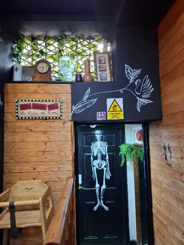 카페 곳곳에 배치된 아기자기한 소품들이 눈길을 사로잡습니다. 해골 모형과 벽에 그려진 그림이 독특한 분위기를 더합니다.