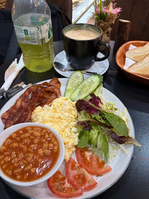 보기만 해도 든든해지는 아침 식사 메뉴. 베이컨, 스크램블 에그, 샐러드, 구운 토마토, 콩 등 푸짐한 구성이 인상적입니다.