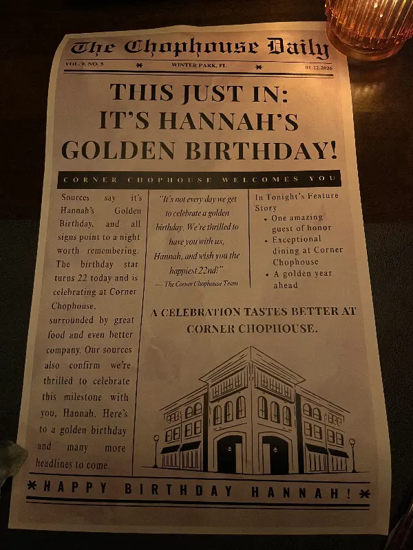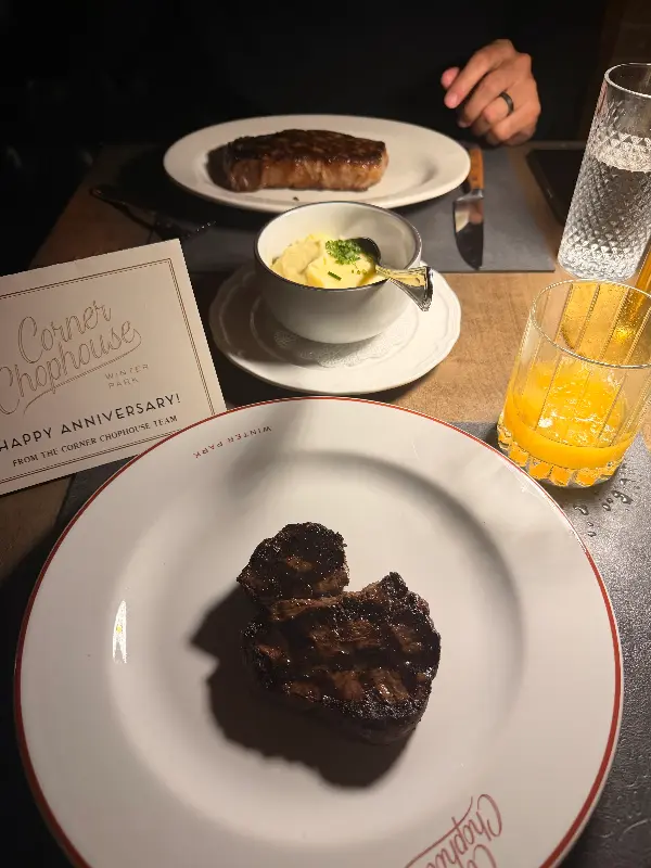 코너 찹하우스는 플로리다 중부에서 맛볼 수 있는 최고의 스테이크 중 하나를 제공합니다. 훌륭한 음식, 세심한 서비스, 따뜻한 분위기, 그리고 감동적인 배려까지, 모든 것이 완벽하게 어우러진 곳입니다. 기념일을 더욱 특별하게 만들고 싶다면, 코너 찹하우스를 방문하여 잊지 못할 추억을 만들어 보세요. 분명 후회하지 않을 선택이 될 것입니다.