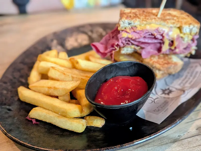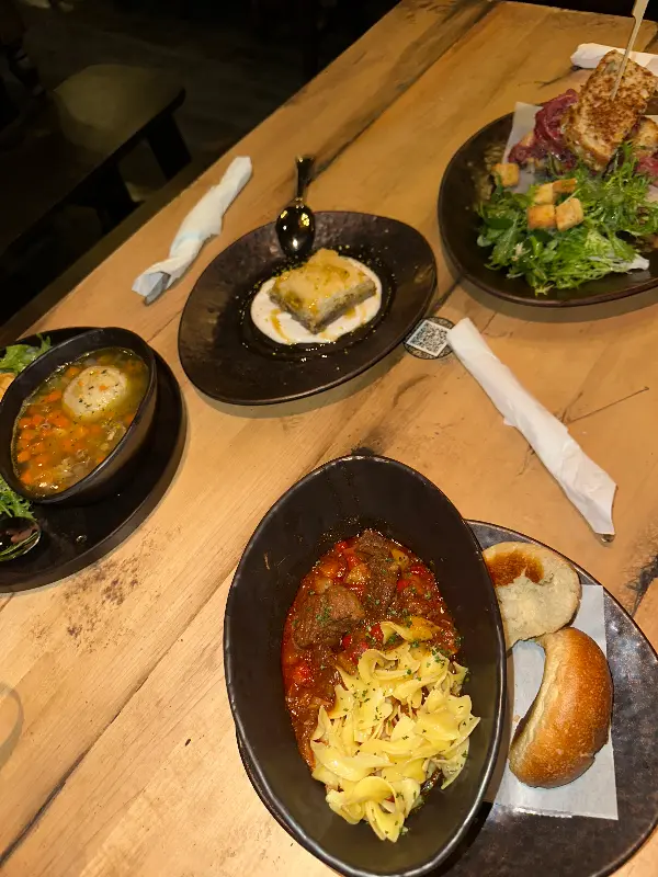 르 고블레 누아르에서는 다양한 메뉴를 즐길 수 있습니다. 칩 비프 샌드위치는 크고 맛있으며, 감자튀김은 신선하고 바삭합니다. 브라트부르스트는 캐러멜라이즈드 양파와 프레첼 번이 어우러져 풍성한 맛을 선사합니다. 사이드 샐러드는 다소 부족하지만 신선하며, 바클라바는 달콤한 디저트로 완벽한 마무리입니다. 맥주 종류도 다양하게 준비되어 있어 취향에 맞게 선택할 수 있습니다.