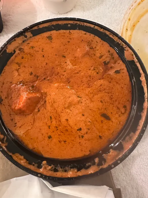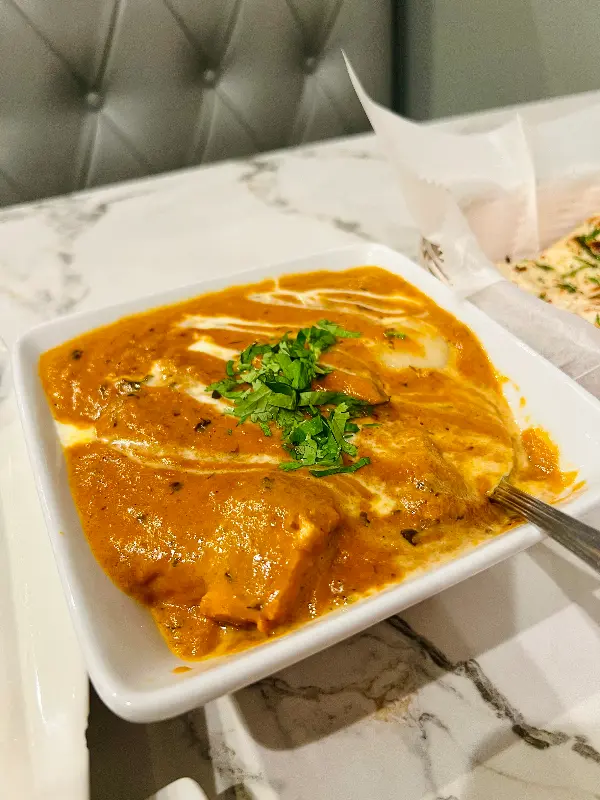 드디어 주문한 음식이 나왔습니다. 짙은 오렌지색의 치킨 티카 마살라는 보기만 해도 식욕을 자극했습니다. 윤기가 흐르는 소스 위에는 신선한 고수가 흩뿌려져 있어, 풍미를 더했습니다.