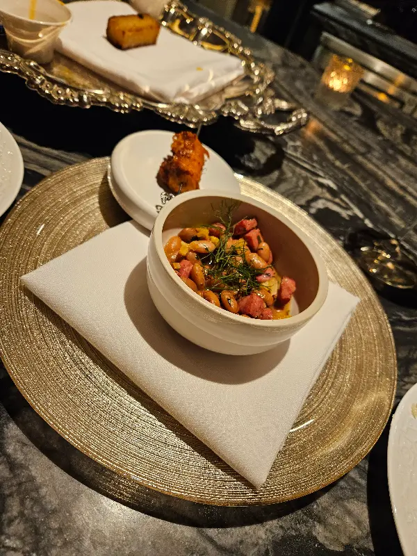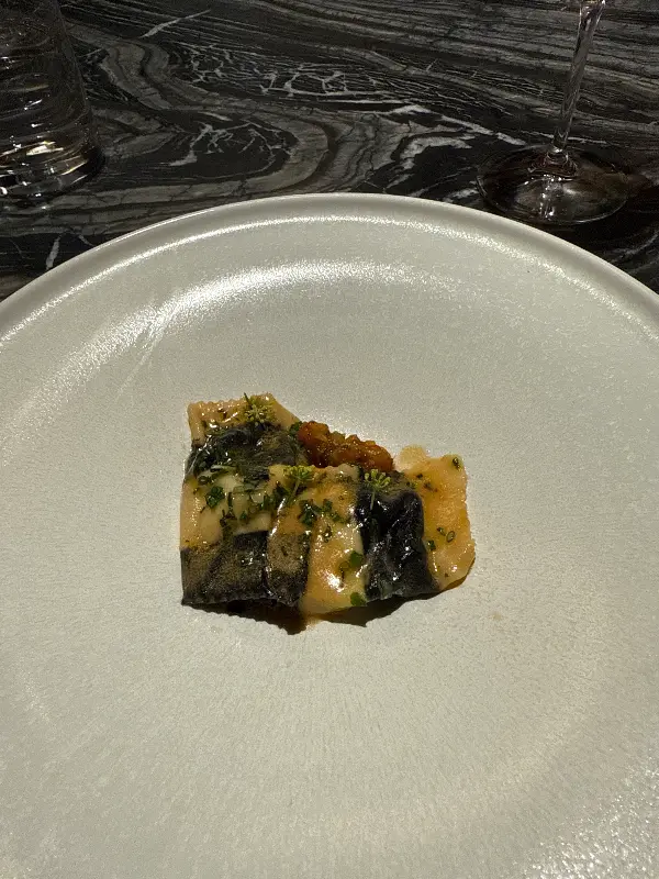 드디어 첫 번째 요리가 나왔습니다. 마치 검은 보석처럼 빛나는 ‘검은 계란’은, 시각적인 아름다움은 물론, 입안 가득 퍼지는 풍미로 감탄을 자아냈습니다. 톡 터지는 노른자의 고소함과 부드러운 흰자의 조화는, 그야말로 환상적이었습니다. 신선한 야채와 허브가 곁들여져, 풍성한 맛과 향을 더했습니다.