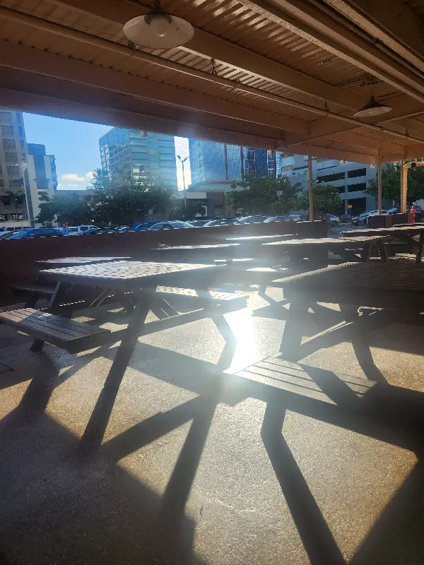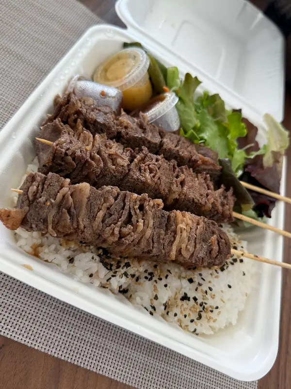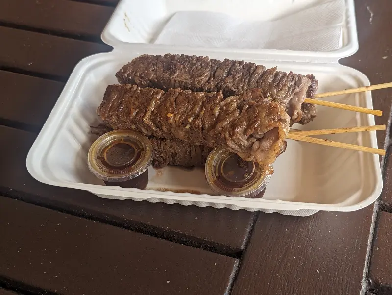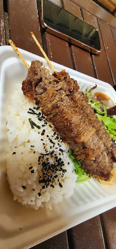 주문은 ‘와규 꼬치’ 두 개가 나오는 플레이트로 결정했습니다. 갓 지은 밥과 신선한 샐러드가 함께 제공된다고 하니, 든든한 한 끼 식사로도 손색없을 것 같았습니다. 주문 후, 꼬치가 구워지는 동안 야외 좌석에 자리를 잡았습니다. 지붕이 있는 덕분에 뜨거운 햇볕을 피할 수 있었지만, 나무 피크닉 테이블은 다소 평범하게 느껴졌습니다.