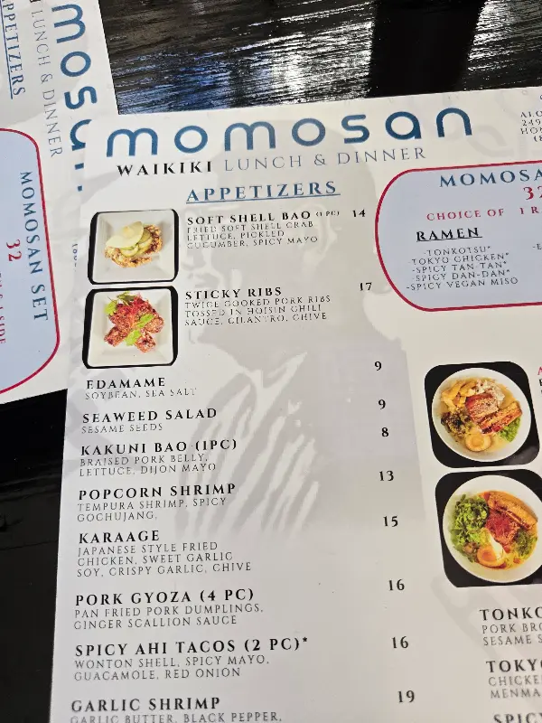 모모산 와이키키에서는 라멘뿐만 아니라 다양한 사이드 메뉴도 즐길 수 있다. 교자, 캘리포니아 롤, Soft Shell Crab Roll 등 라멘과 함께 곁들이기 좋은 메뉴들이 준비되어 있다. 특히, 점심 라멘 세트 메뉴에는 음료도 포함되어 있어 더욱 합리적인 가격으로 즐길 수 있다.