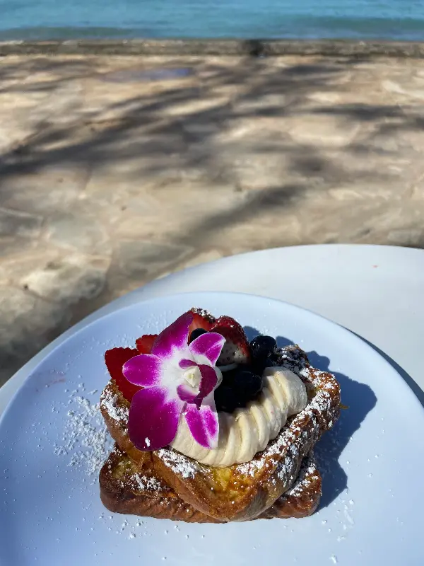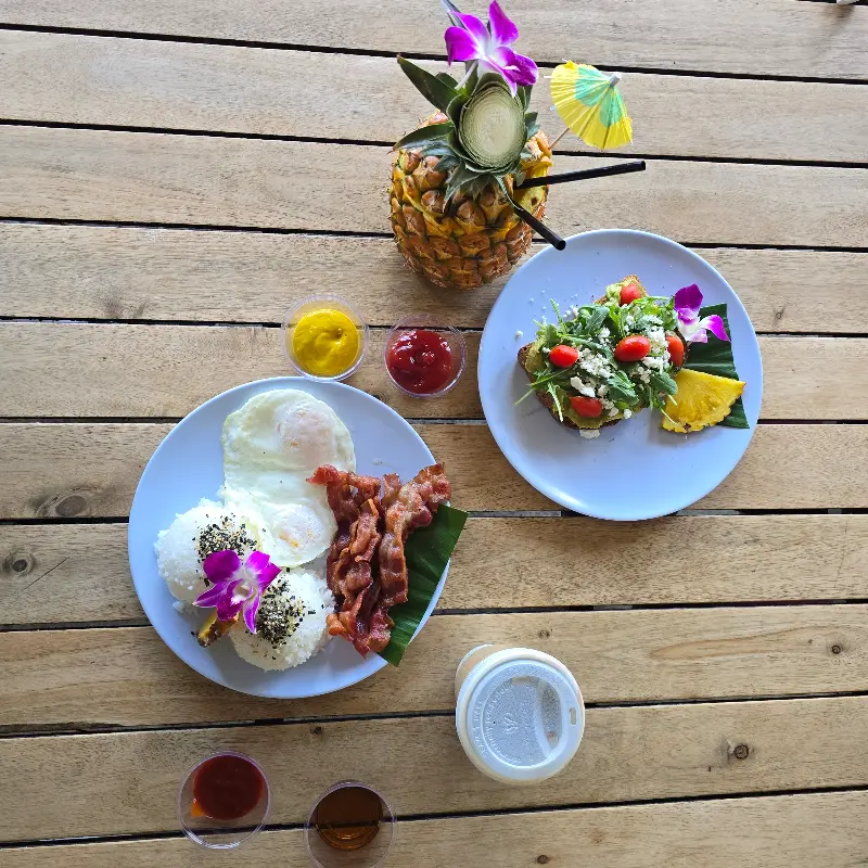 카페에 들어서자마자 눈에 들어오는 것은 끝없이 펼쳐진 푸른 바다. 투명한 에메랄드빛 바다가 햇빛에 반짝이는 모습은 그야말로 장관이다. 마치 그림 같은 풍경을 감상하며 자리에 앉으니, 기분 좋은 바람이 살랑살랑 불어온다. 테이블 위에는 하와이를 상징하는 듯한 싱싱한 꽃들이 놓여 있어, 이곳이 진정한 하와이임을 다시 한번 느끼게 해준다.