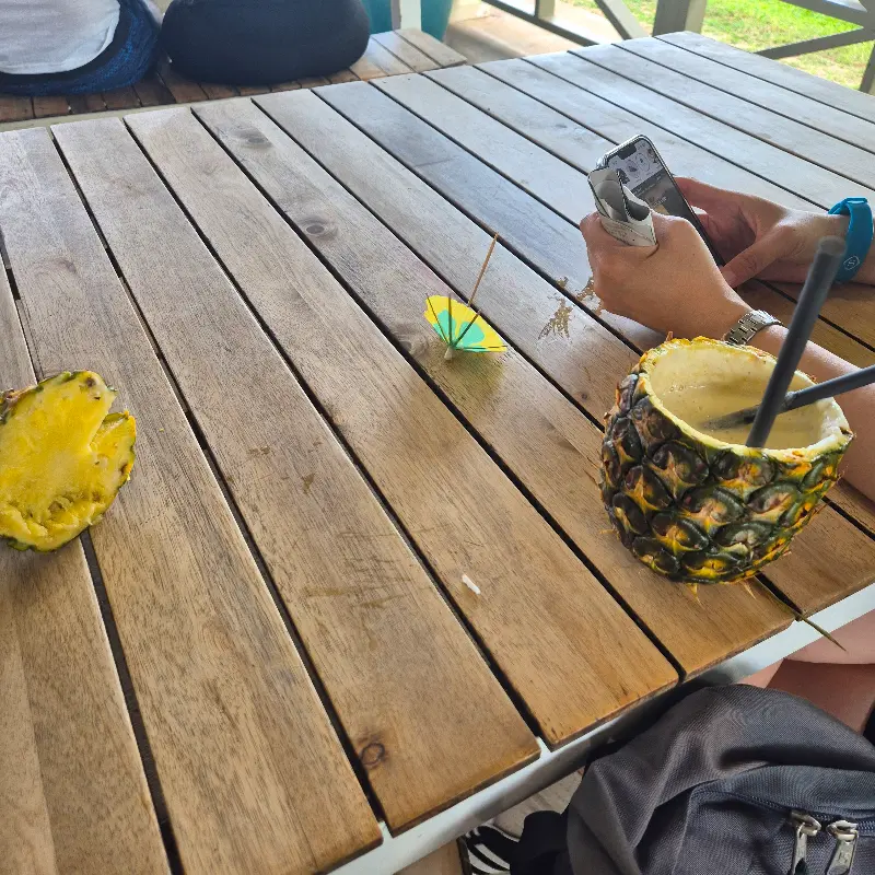 주문한 파인애플 스무디가 나오자, 감탄사가 절로 터져 나왔다. 통째로 파낸 파인애플 안에 시원한 스무디가 가득 담겨 있고, 알록달록한 열대 과일과 귀여운 파라솔 장식이 더해져 완벽한 비주얼을 자랑한다. 사진을 찍는 동안에도 달콤한 파인애플 향이 코를 자극하며 기대감을 높였다.