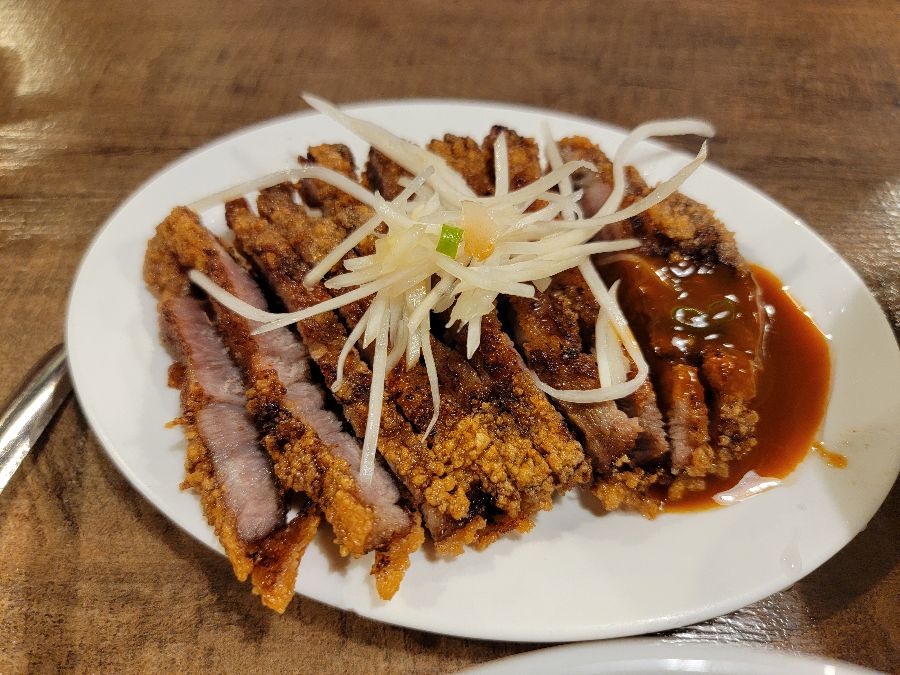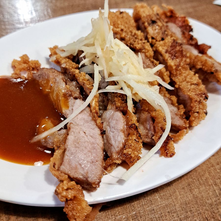 바삭하게 튀겨낸 돼지고기 커틀릿과 신선한 생강 채. 튀김 요리의 정석을 보여준다.