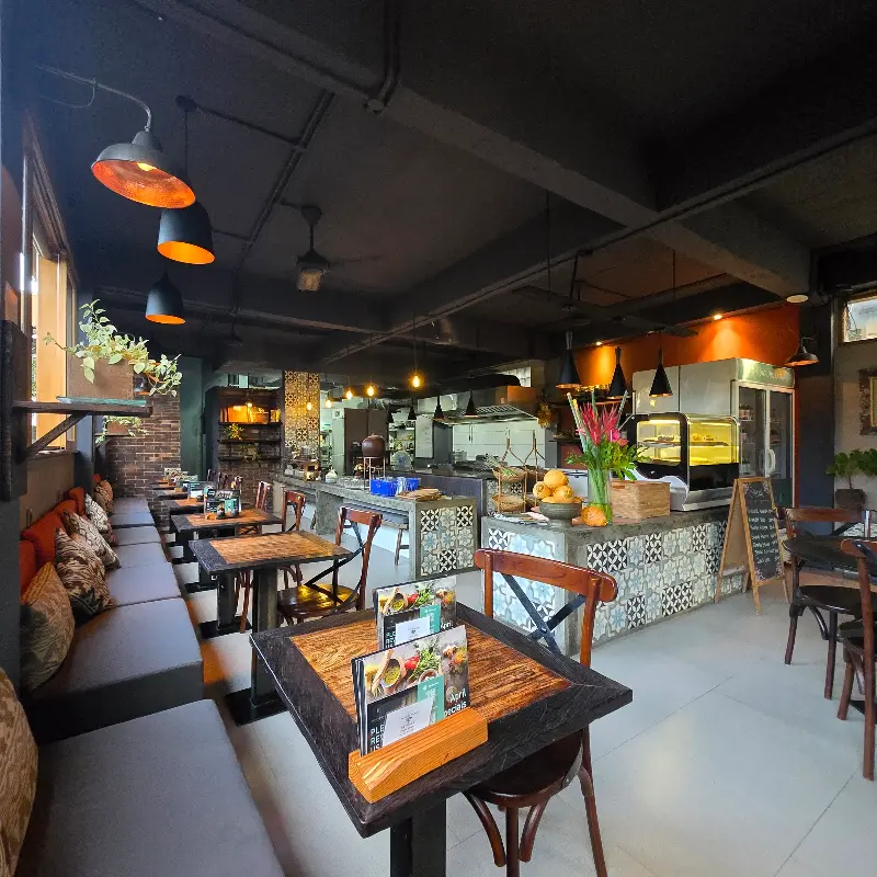레스토랑 내부는 차분한 색감과 은은한 조명으로 꾸며져 있으며, 곳곳에 놓인 식물들이 싱그러움을 더한다. 테이블 간 간격이 넓어 다른 손님들을 신경 쓰지 않고 오롯이 식사에 집중할 수 있다는 점도 매력적이다. 사진에서 볼 수 있듯이, 천장은 어두운 색으로 마감되어 있지만, 곳곳에 설치된 조명 덕분에 아늑하고 따뜻한 분위기가 연출된다. 테이블과 의자는 나무 소재로 만들어져 자연 친화적인 느낌을 강조하고, 벽면에는 발리의 전통적인 장식품들이 걸려 있어 현지 문화를 느낄 수 있다. 창밖으로 보이는 푸른 정원은 싱그러움을 더하며, 마치 숲 속에서 식사하는 듯한 기분을 선사한다.