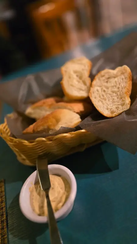고민 끝에, 이곳의 대표 메뉴인 립과 함께 어니언 링, 포테이토 스킨, 그리고 상그리아를 주문했습니다. 메뉴를 주문하자, 식전 빵과 버터가 나왔습니다. 따뜻하고 부드러운 빵은 버터와 함께 먹으니 정말 맛있었습니다.