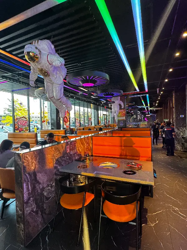 식당 내부는 온통 우주적인 분위기로 가득했습니다. 천장에 매달린 거대한 우주인 모형은 마치 우주를 유영하는 듯한 느낌을 주었고, 벽면을 장식한 네온사인과 은하수 그림은 몽환적인 분위기를 더했습니다. 테이블마다 설치된 환풍구는 마치 우주선의 엔진처럼 보였습니다. 푸른 조명이 감도는 실내는 독특하고 세련된 분위기를 자아냈습니다.