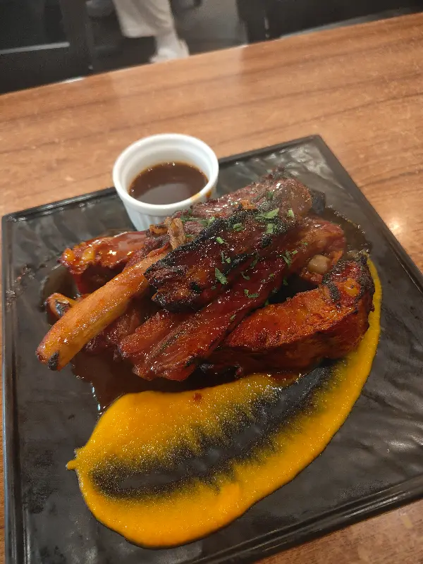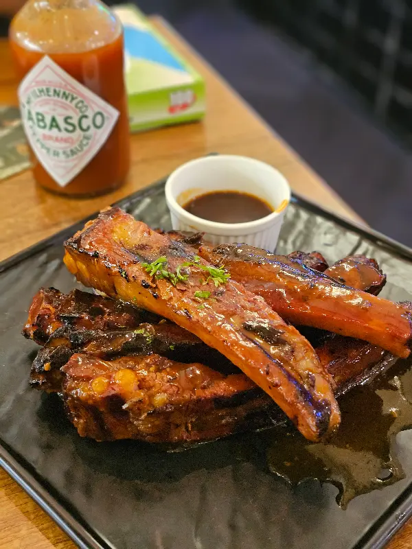 드디어 기다리고 기다리던 로스트 포크 립이 테이블에 놓였습니다. 윤기가 자르르 흐르는 돼지갈비는 보기만 해도 군침이 돌았습니다. 칼을 대자 부드럽게 잘리는 고기의 결, 육즙이 풍부하게 흘러나오는 모습에 감탄했습니다.