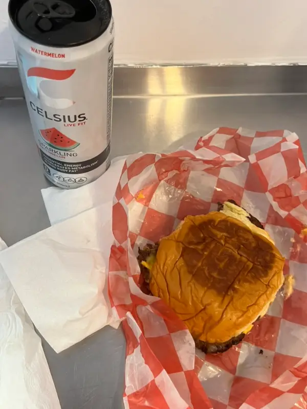 드디어 내 손에 들어온 더블 치즈 버거. 겉으로 보기에도 범상치 않았다. 번은 황금빛 갈색으로 윤기가 흘렀고, 패티는 두툼하게 쌓여 있었다. 붉은색 체크무늬 포장지를 살짝 들추자, 녹아내린 치즈가 흘러넘치는 모습이 드러났다.