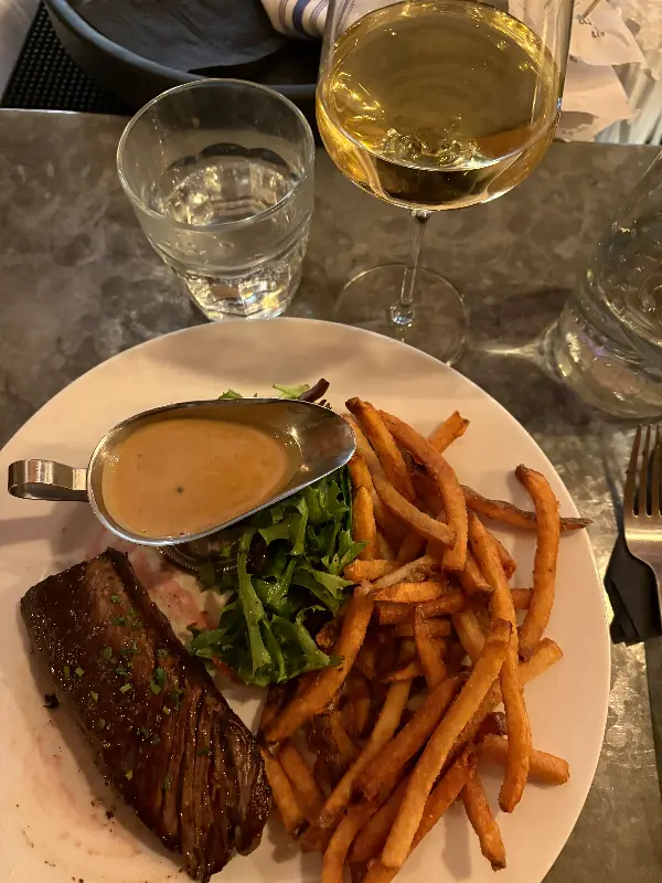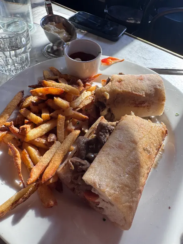 프렌치 어니언 수프가 저녁 메뉴에만 있다는 소식에 잠시 실망했지만, 곧바로 주문한 스테이크 샌드위치가 그 아쉬움을 완벽하게 잊게 해 주었다. 겉은 바삭하고 속은 촉촉한 빵 사이에 육즙 가득한 스테이크가 듬뿍 들어있어, 한 입 베어 무는 순간 입안 가득 풍미가 퍼져 나갔다. 샌드위치와 함께 제공된 바삭한 감자튀김은 짭짤하면서도 고소한 맛으로 완벽한 조화를 이루었다.