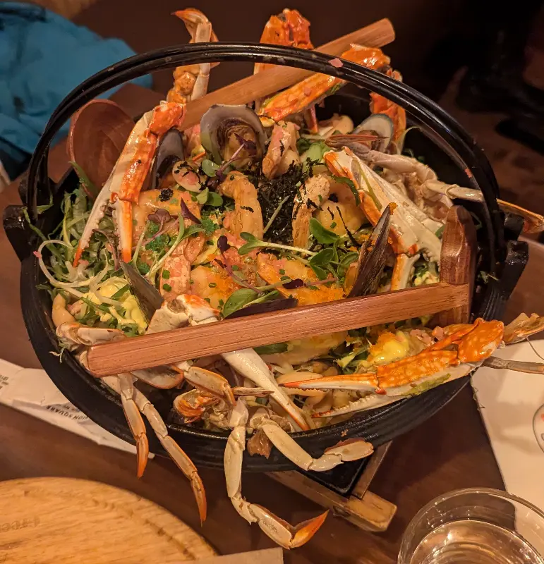 돌판 비빔밥을 즐기는 동안, 해물탕이 테이블에 놓였다. 큼지막한 냄비 안에는 꽃게, 새우, 조개 등 다양한 해산물이 푸짐하게 들어 있었다. 국물을 한 입 맛보니, 깊고 시원한 맛이 온몸을 감쌌다. 칼칼하면서도 깔끔한 국물은 추운 날씨에 언 몸을 녹여주기에 충분했다. 해산물도 신선하고 쫄깃쫄깃해서 먹는 재미가 있었다.