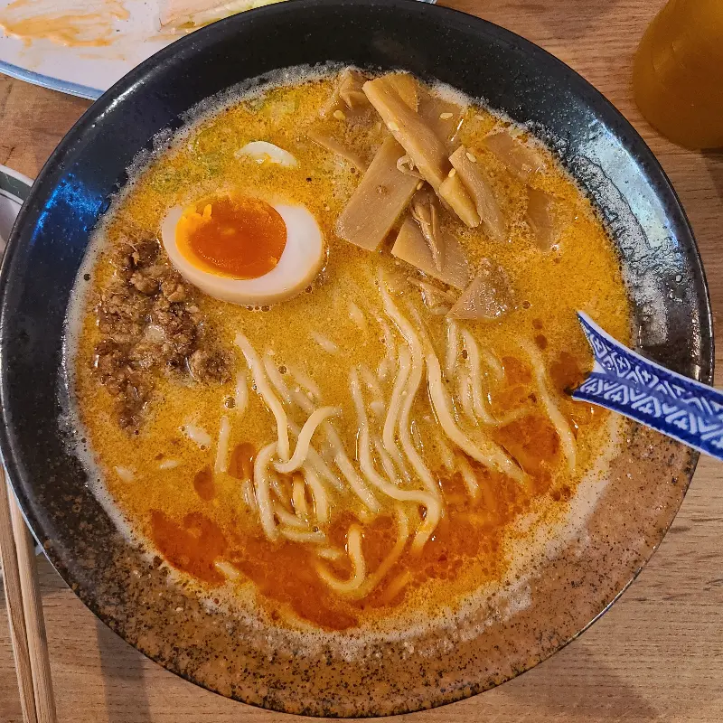 잠시 후, 드디어 기다리고 기다리던 미소라멘이 나왔다. 김이 모락모락 나는 국물 위로 차슈, 반숙 계란, 옥수수, 죽순, 파가 넉넉하게 올려져 있었다. 뽀얀 국물은 보기만 해도 깊고 진한 맛이 느껴졌다.