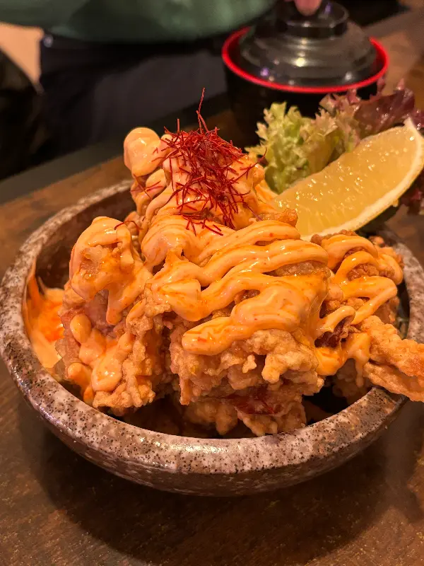 가라아게를 한 입 베어 물자, 바삭하는 소리와 함께 육즙이 입안 가득 퍼져 나갔다. 겉은 바삭하고 속은 촉촉한, 겉바속촉의 정석이었다. 짭짤하면서도 고소한 맛이 맥주를 절로 부르는 맛이었다. 특히 함께 나온 스파이시 마요 소스는 가라아게의 맛을 한층 더 끌어올려 주었다. 느끼함은 잡아주고 매콤함은 더해주는 환상의 조합이었다.