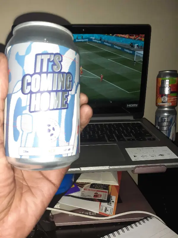 노트북 화면 가득 펼쳐진 축구 경기, 그리고 손에 들린 ‘잇츠 커밍 홈’ 필스너. 완벽한 조합!