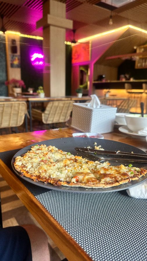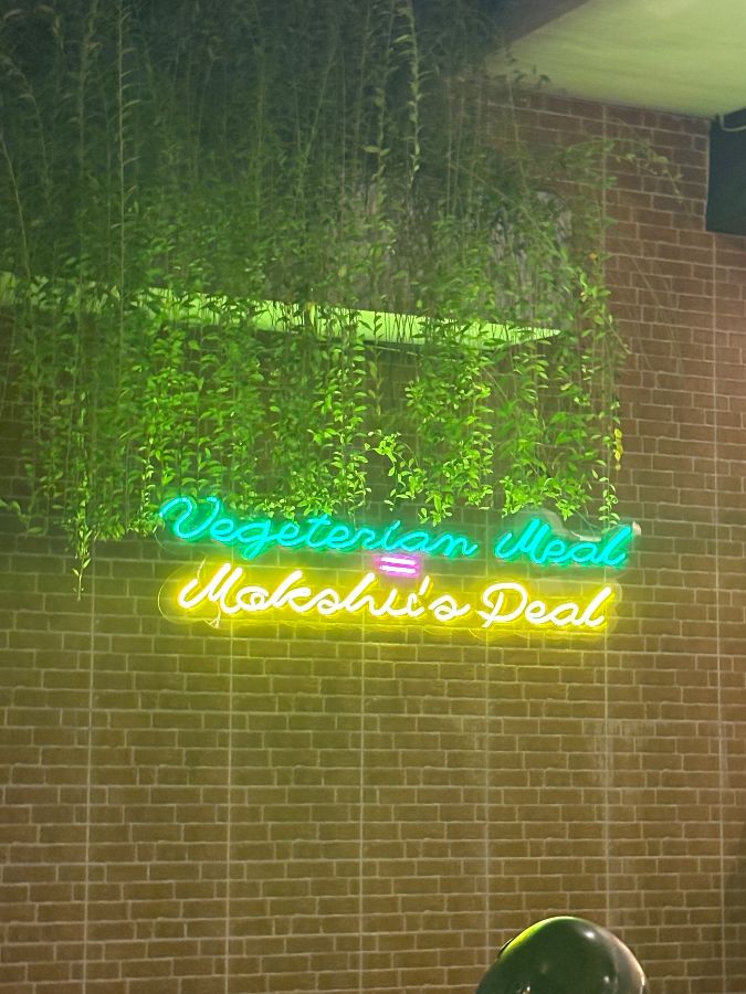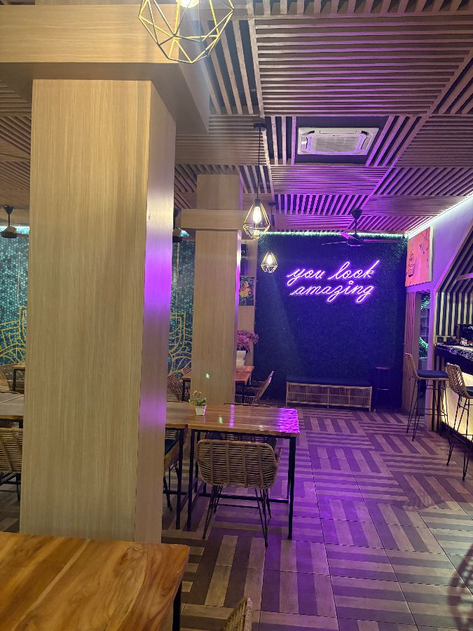 문을 열고 들어서면, “you look amazing”이라는 네온사인이 밝게 빛나며 방문객들을 반깁니다. 이는 단순히 문구 이상의 의미를 지닙니다. 이곳을 찾는 모든 이들에게 긍정적인 메시지를 전달하며, 환영받는다는 느낌을 선사합니다. 실내 곳곳에는 푸른 식물들이 드리워져 생기 넘치는 공간을 만들고, 벽면을 장식한 독특한 예술 작품들은 인도의 전통과 현대적인 감각이 조화롭게 어우러진 인테리어를 완성합니다. 나무 소재의 테이블과 의자, 그리고 바닥의 기하학적인 패턴 타일은 공간에 깊이감을 더하며, 편안하면서도 세련된 인상을 줍니다.