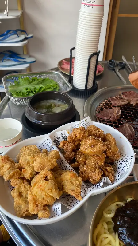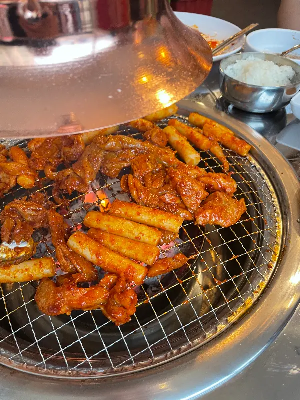 옆 테이블의 닭갈비는 빨간 양념이 숯불에 구워지며 매콤한 향을 풍겼다. 닭갈비와 함께 떡도 구워 먹는 모습이 정말 맛있어 보였다. 다음 방문 때는 꼭 닭갈비를 먹어봐야겠다.