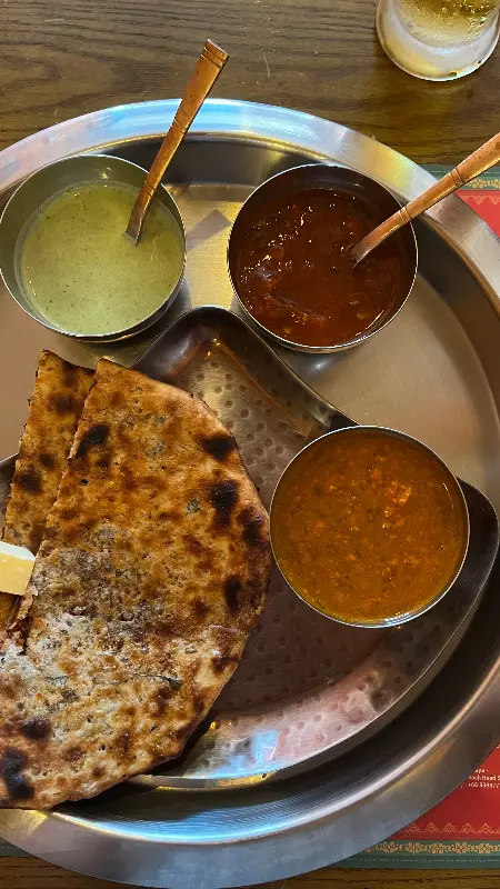 다른 날, Maung Zinoo의 추천으로 알루 파로타와 펀자비 라씨를 맛보았습니다. 알루 파로타는 감자를 주재료로 하여 만든 인도식 빵으로, 겉은 바삭하고 속은 부드러운 식감이 일품입니다. 특히 이곳의 알루 파로타는 겉면에 버터가 살짝 녹아내려 더욱 고소하고 풍미가 깊었습니다.