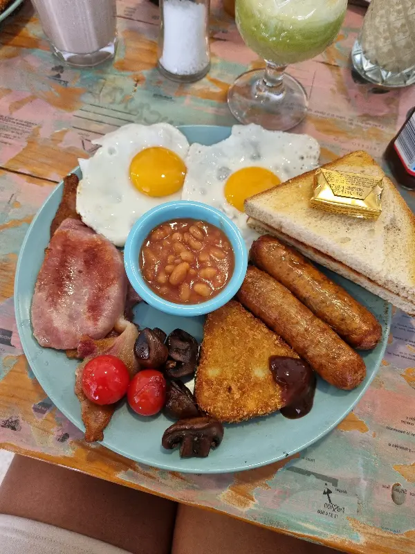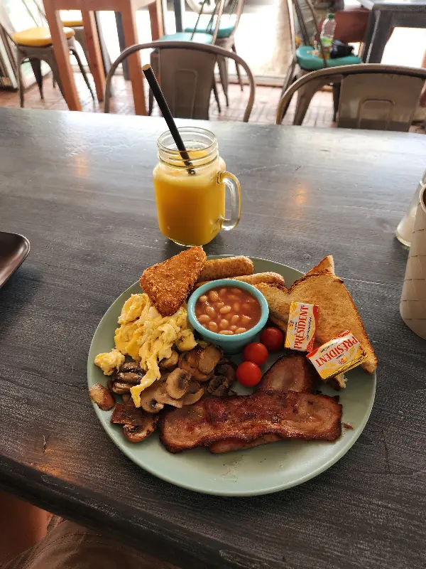 주문한 음식이 나오기까지는 시간이 조금 걸렸지만, 기다림마저 즐거웠다. 드디어 모습을 드러낸 잉글리시 브렉퍼스트! 접시 가득 담긴 푸짐한 양에 감탄했다. 윤기가 흐르는 베이컨, 촉촉한 스크램블 에그, 노릇하게 구워진 토스트, 짭짤한 소시지, 그리고 톡톡 터지는 식감의 베이크드 빈까지. 보기만 해도 군침이 돌았다. 신선한 오렌지 주스도 함께 나왔는데, 갓 짜낸 듯 상큼한 향이 식욕을 더욱 자극했다.