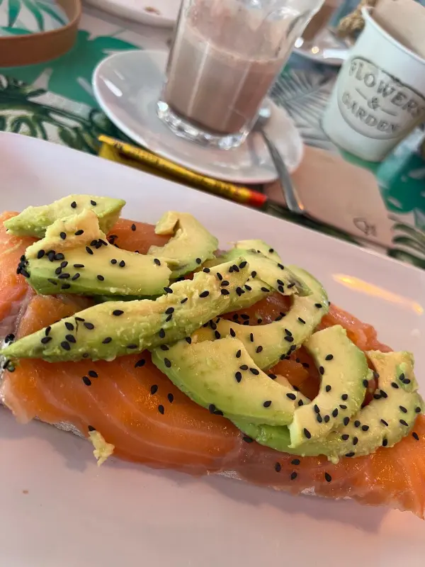 신선한 연어와 아보카도가 듬뿍 올라간 오픈 토스트