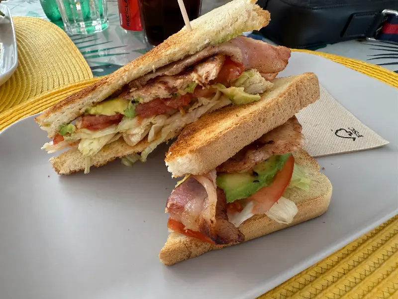 신선한 야채와 닭가슴살, 베이컨, 아보카도가 층층이 쌓인 클럽 샌드위치