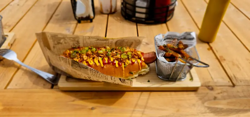 주문 후, 테이블에 놓인 소스들을 살펴보았다. 핫도그와 곁들여 먹을 다양한 소스들이 준비되어 있었다. 곧이어 주문한 핫도그가 나왔는데, 음식 프레젠테이션이 정말 사랑스러웠다. 정갈하게 담겨 나온 핫도그는 시각적으로도 훌륭했다. 웨이트리스의 친절한 서비스는 맛을 더욱 풍요롭게 만들어주었다. 점심시간이라 조용했지만, 저녁에는 활기가 넘친다고 하니, 다음에는 저녁에 방문해봐야겠다는 생각이 들었다.