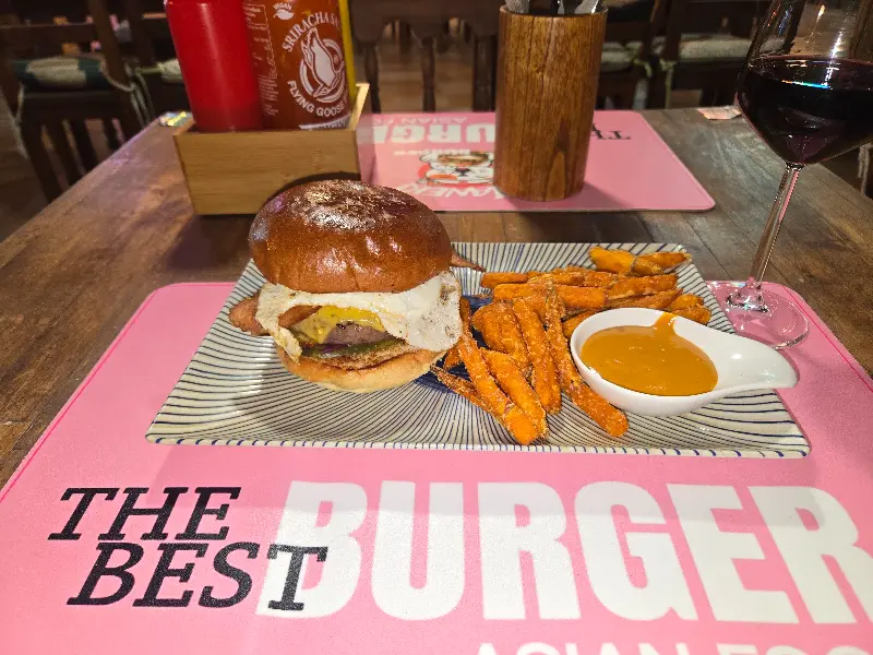 테이블 위에 놓인 핑크색 매트와 버거, 감자튀김, 소스의 조화가 식욕을 자극합니다.