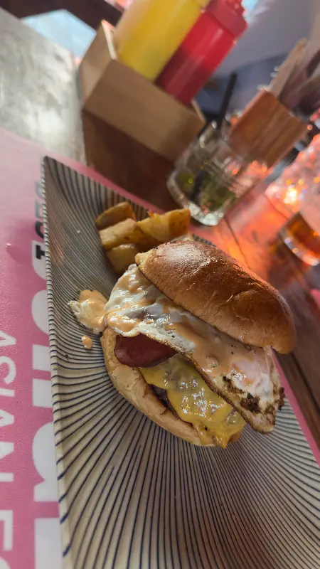 결국, 저는 마네키의 대표 메뉴 중 하나인 버거와 파타타스 브라바스를 주문했습니다. 잠시 후, 눈앞에 나타난 버거는 사진보다 훨씬 더 훌륭한 비주얼을 자랑했습니다. 윤기가 흐르는 빵과 신선한 재료들이 층층이 쌓여있는 모습은 보기만 해도 군침이 돌았습니다.