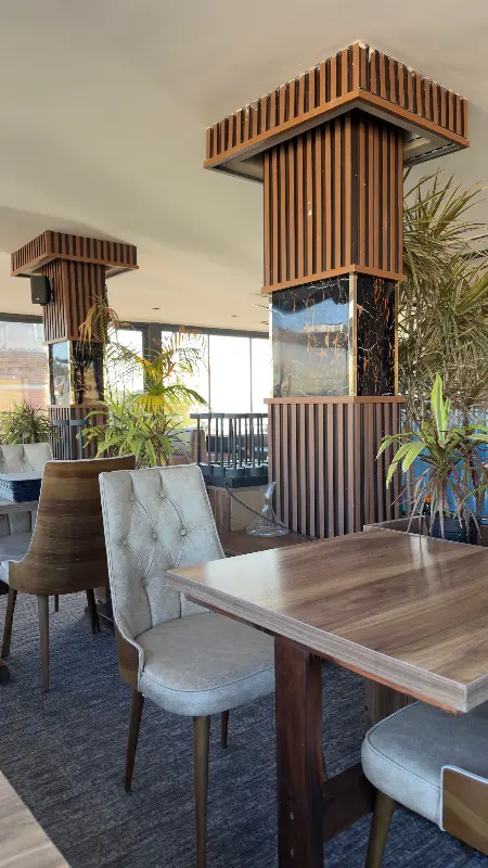 곳곳에 놓인 초록빛 화분들은 싱그러움을 더하고, 테이블 간 간격도 넉넉해서 편안하게 식사를 즐길 수 있었다. 은은한 조명 아래, 나무 소재로 포인트를 준 인테리어는 고급스러우면서도 아늑한 분위기를 자아냈다. 기둥 장식은 독특한 분위기를 더하며 실내 공간의 개성을 드러낸다. 마치 누군가의 멋진 테라스에 초대받은 듯한 느낌이었다.