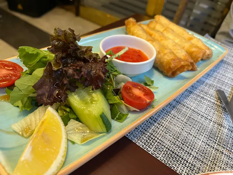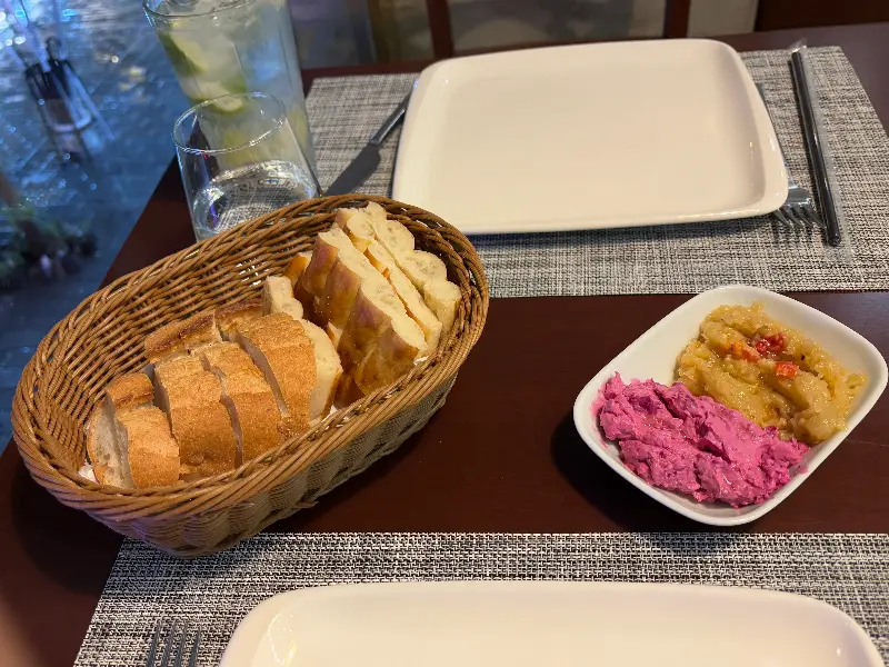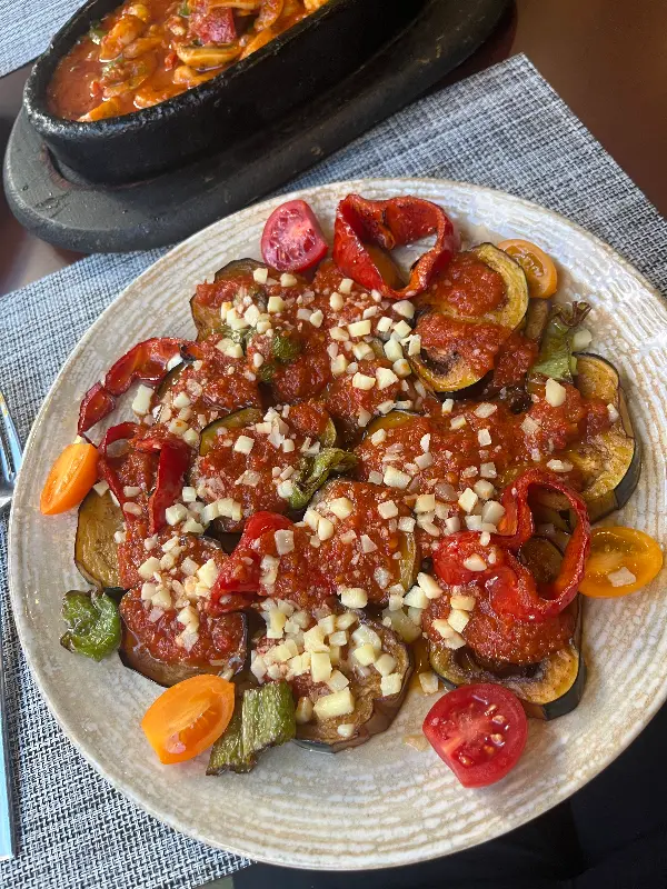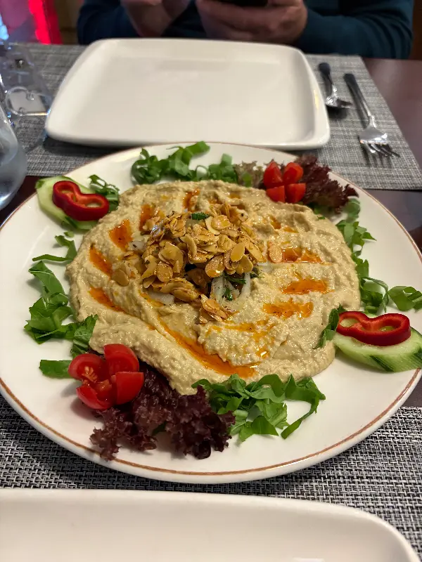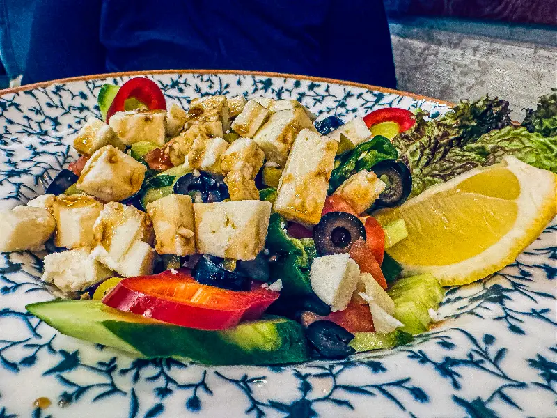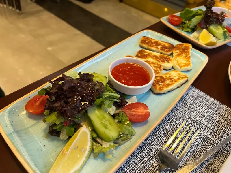가장 먼저 눈에 띈 것은 구운 할루미였습니다. 겉은 바삭하고 속은 쫄깃한 할루미 치즈는 신선한 채소와 함께 제공되어, 입맛을 돋우는 완벽한 에피타이저였습니다. 사진에서 보이는 것처럼 할루미 치즈는 먹기 좋은 크기로 잘려져 있으며, 샐러드와 함께 곁들여 먹으니 더욱 풍성한 맛을 느낄 수 있었습니다.