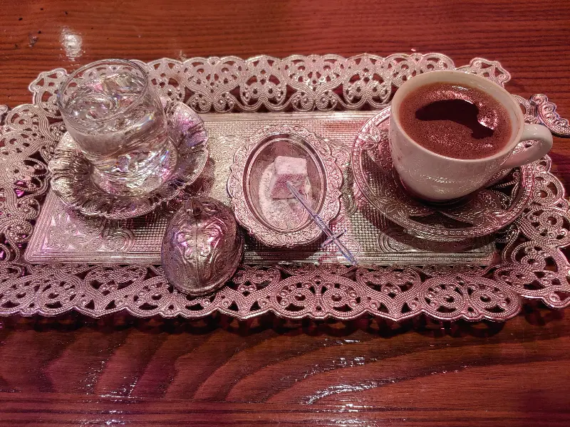 식사를 마치니 터키식 커피를 서비스로 제공해주셨습니다. 은으로 장식된 쟁반 위에 커피와 물, 그리고 달콤한 터키쉬 딜라이트가 함께 나왔습니다.