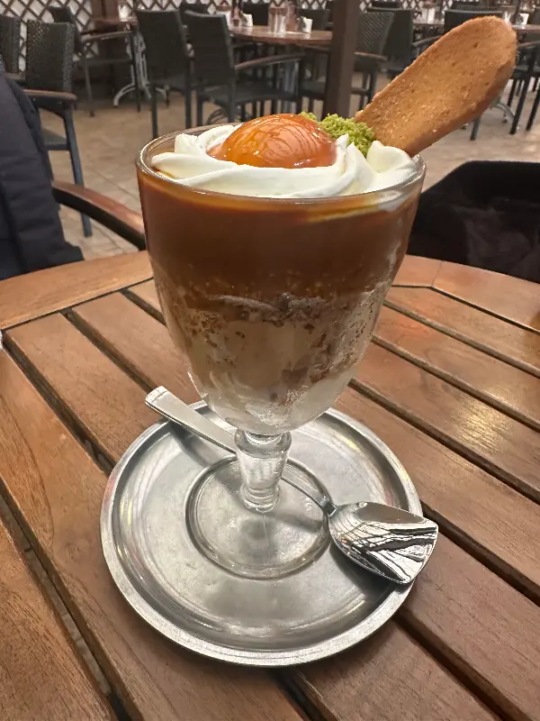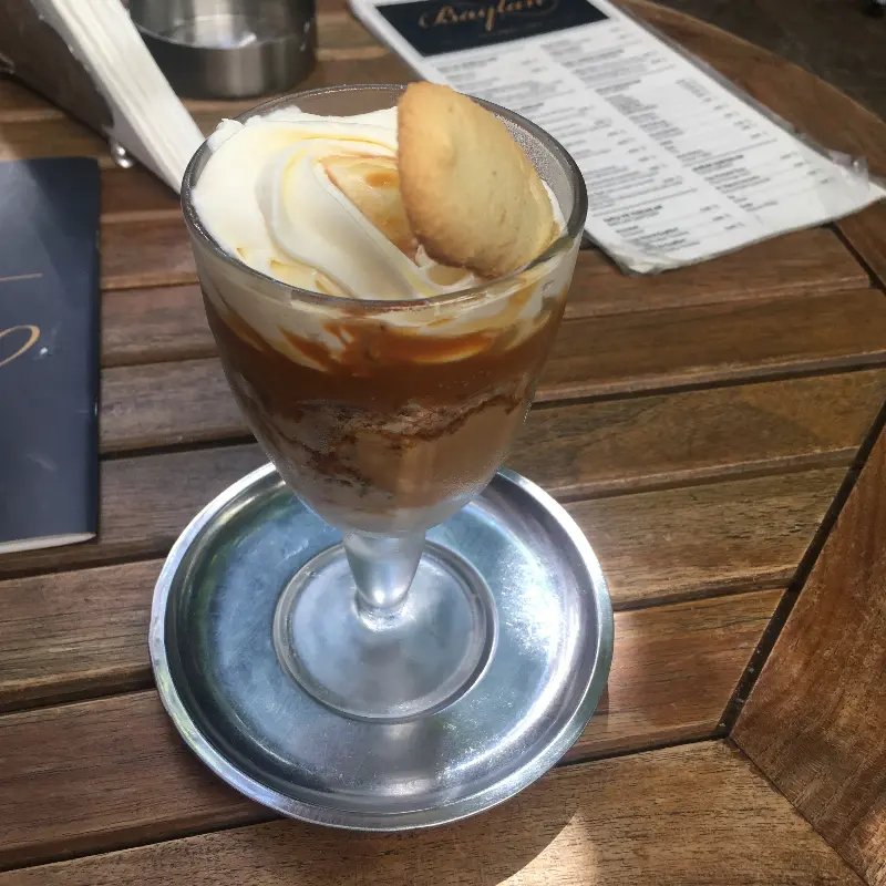 드디어 ‘쿠프 그리예’가 나왔다. 투명한 글라스에 층층이 쌓인 아이스크림, 카라멜 소스, 생크림, 그리고 크런치의 조화는 시각적으로도 훌륭했다. 맨 위에는 고양이 혀 모양의 비스킷이 앙증맞게 꽂혀 있었다. 사진을 찍는 동안에도 달콤한 향이 끊임없이 코를 자극했다.