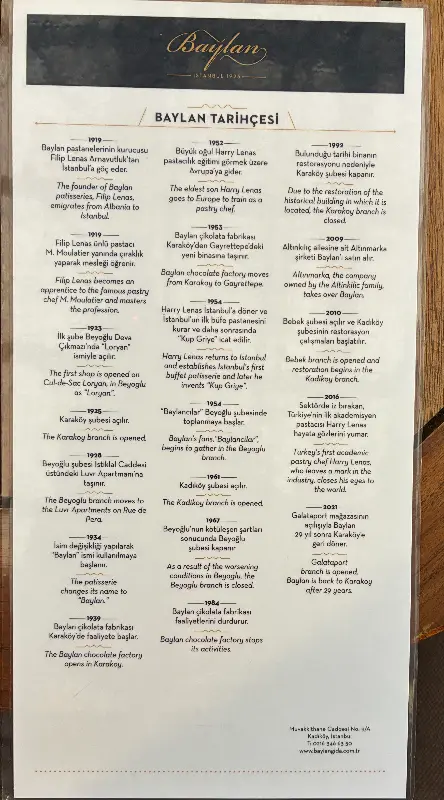 바일란은 1954년부터 영업을 시작한, 이스탄불에서 가장 오래된 카페 중 하나다. 오랜 세월 동안 변함없는 맛과 품질을 유지해온 덕분에, 현지인들의 사랑을 꾸준히 받고 있다. 심지어 30년 전에 할머니와 함께 왔었다는 손님도 있을 정도다. 웨이터가 할머니, 할아버지를 알아보았다는 후기는 바이란이 얼마나 오랜 시간 동안 사람들의 추억 속에 자리 잡았는지 짐작하게 한다.