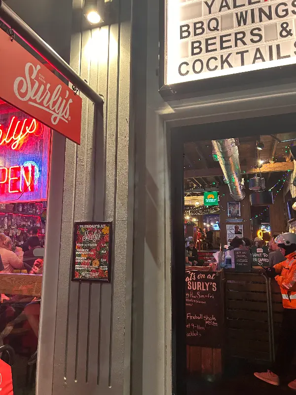 Surly’s의 입구는 강렬한 네온사인과 아메리칸 스타일 간판이 눈길을 사로잡습니다.