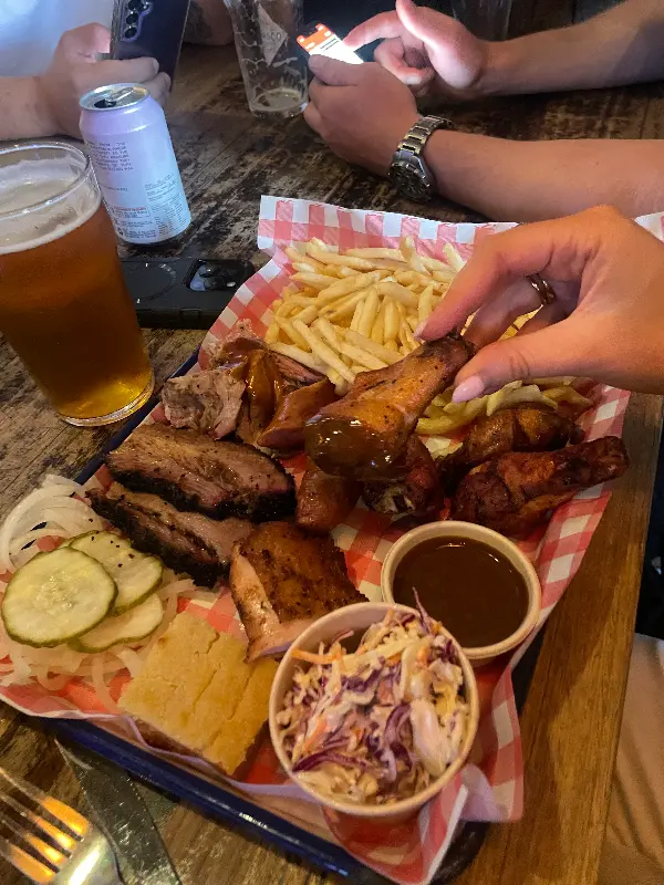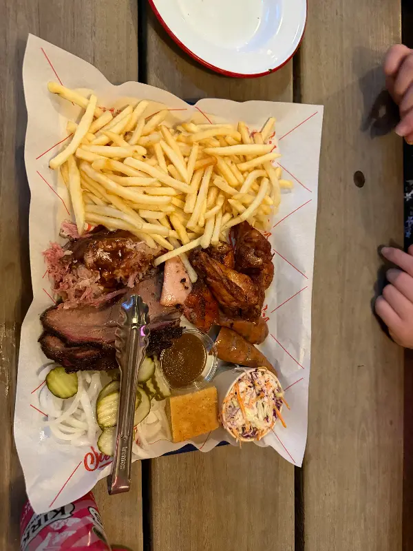 잠시 후, 드디어 기다리고 기다리던 메뉴들이 테이블 위에 차려졌습니다. 가장 먼저 눈에 들어온 것은 푸짐한 양의 바비큐 플래터였습니다. 플래터 안에는 브리스킷, 풀드 포크, 립, 치킨 윙 등 다양한 종류의 고기가 가득 담겨 있었고, 사이드 메뉴로는 코울슬로, 피클, 콘브레드가 함께 제공되었습니다.