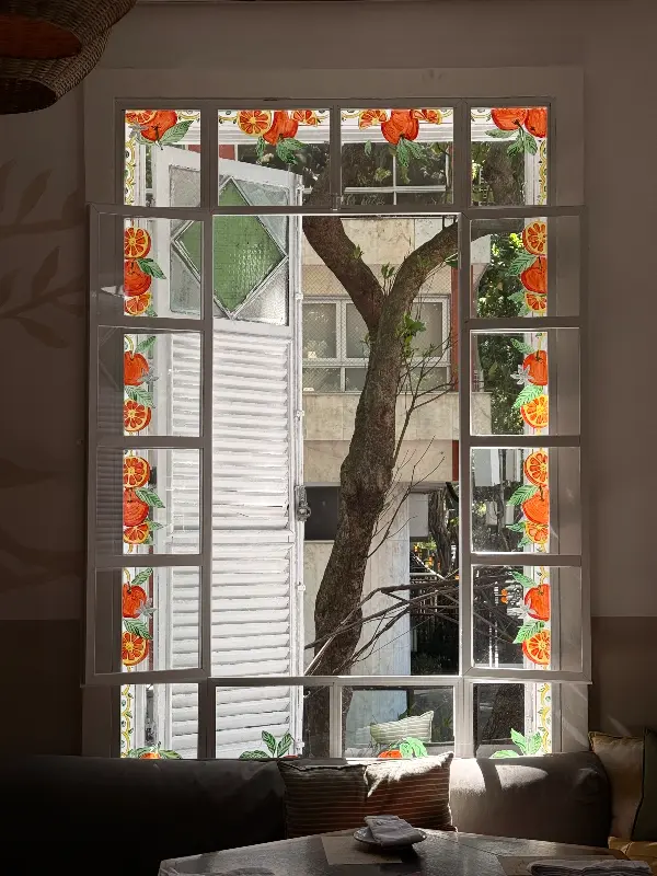 Za Za Bistrô의 아름다운 창가 좌석. 오렌지 그림이 그려진 창문 너머로 햇살이 따스하게 들어온다.