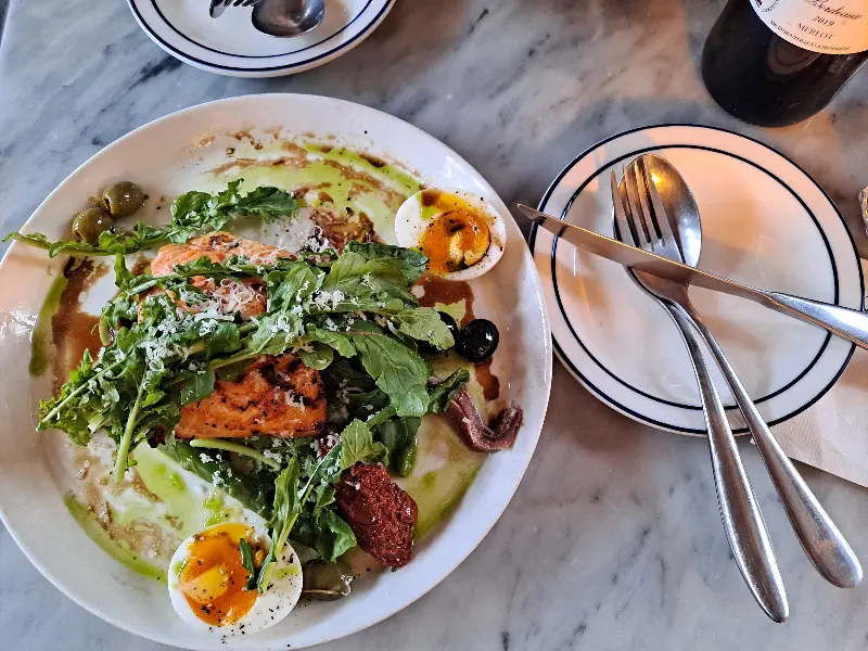 메뉴판을 펼치니 다양한 프랑스 요리가 눈에 들어왔다. 고민 끝에 가장 끌리는 메뉴인 비프 부르기뇽과 연어 스테이크, 키쉬 샐러드를 주문했다. 와인 종류도 다양했지만, 오늘은 식사에 집중하기로 했다.