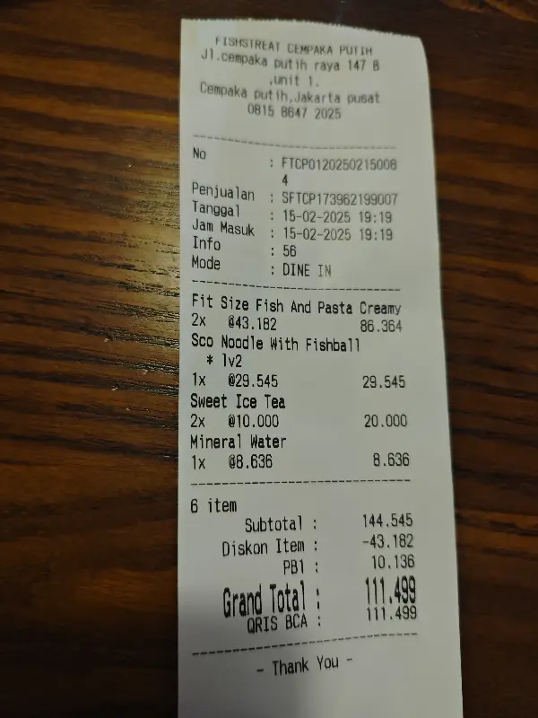 Fish Streat의 가장 큰 장점 중 하나는 합리적인 가격이다. 신선한 해산물 요리를 부담 없는 가격으로 즐길 수 있다는 점이 매력적이다. Image 1에 보이는 영수증을 보면, Fit Size Fish And Pasta Creamy 2개와 Sco Noodle With Fishball 1개, Sweet Ice Tea 2개, Mineral Water 1개를 시켰는데, 총 가격이 111,499 루피아(한화 약 9,500원)밖에 되지 않는다. 저렴한 가격에 맛있는 음식을 즐길 수 있으니, 많은 사람들이 Fish Streat를 찾는 이유를 알 것 같다.