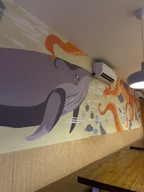 소셜 미디어에서 입소문이 자자한 Fish Streat. 드디어 오늘, 그 맛을 직접 경험하기 위해 셈파카(Cempaka)로 향했다. 폭우가 쏟아지는 날이었지만, 맛있는 음식을 향한 기대감은 빗줄기보다 더욱 거셌다. 가게 문을 열자 따뜻한 기운이 느껴졌다. 아늑한 공간은 생각보다 넓지 않았지만, 4~5개 정도의 테이블이 오밀조밀하게 놓여 있어 편안한 분위기를 자아냈다. 벽면에 그려진 거대한 고래 그림이 눈길을 사로잡았다. 파스텔톤 색감은 몽환적인 분위기를 더하며, 마치 바닷속 세계에 들어온 듯한 느낌을 선사했다.
