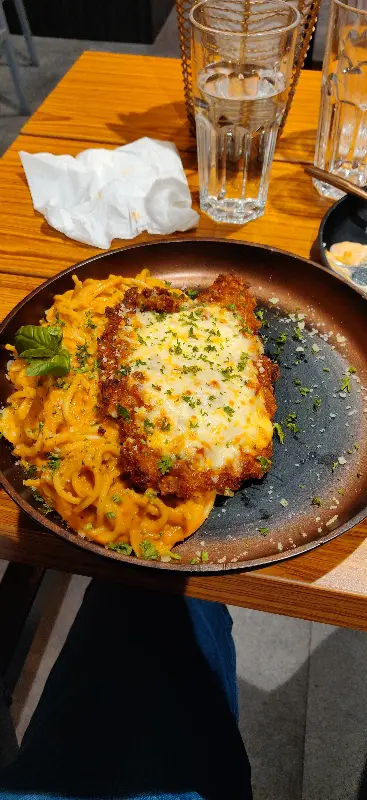 드디어 기다리고 기다리던 음식이 나왔다. 먼저 나온 것은 파스타였다. 접시 가득 담긴 파스타 위에는 큼지막한 치킨 커틀렛이 올려져 있었다.