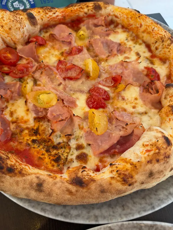 화덕에서 갓 구워져 나온 따끈한 피자, 햄과 신선한 토마토의 조화가 환상적입니다.