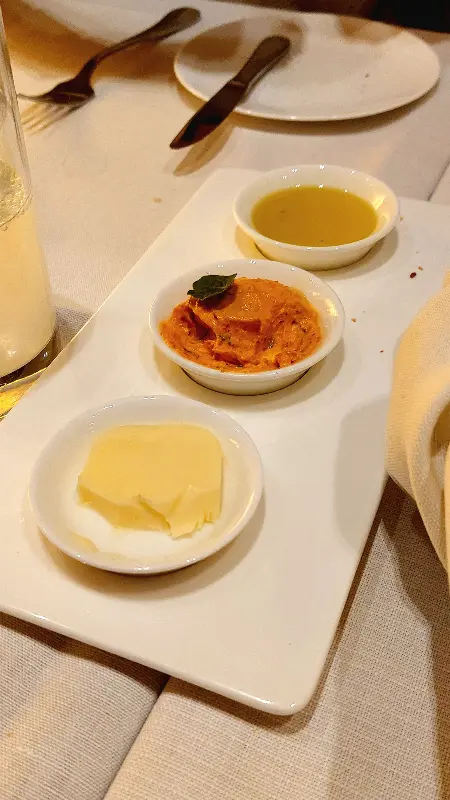 테이블 위에 놓인 앙증맞은 세 개의 볼은 식사의 시작을 알리는 핑거푸드입니다. 부드러운 버터, 상큼한 오렌지 소스, 그리고 매콤한 토마토 페이스트는 입안 가득 퍼지는 다채로운 풍미로 미각을 자극합니다.