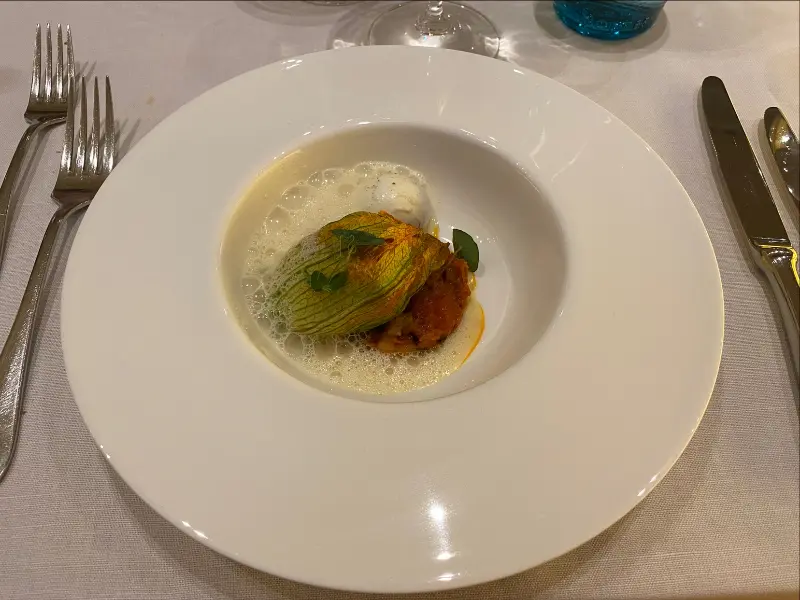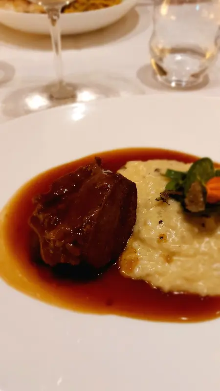 잘 구워진 생선 요리는 겉은 바삭하고 속은 촉촉하여 입안에서 살살 녹습니다. 생선 아래 깔린 리조또는 부드럽고 고소하며, 신선한 채소는 상큼함을 더합니다.
