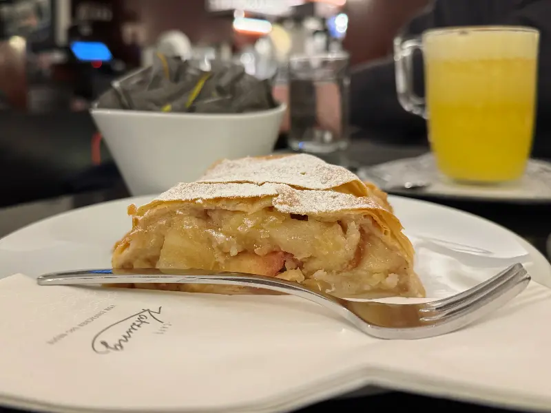 갓 구워져 따뜻한 애플 스트루델은 얇은 페이스트리 안에 사과, 건포도, 견과류가 가득 들어 있어 씹을수록 고소하고 달콤한 풍미가 느껴진다.