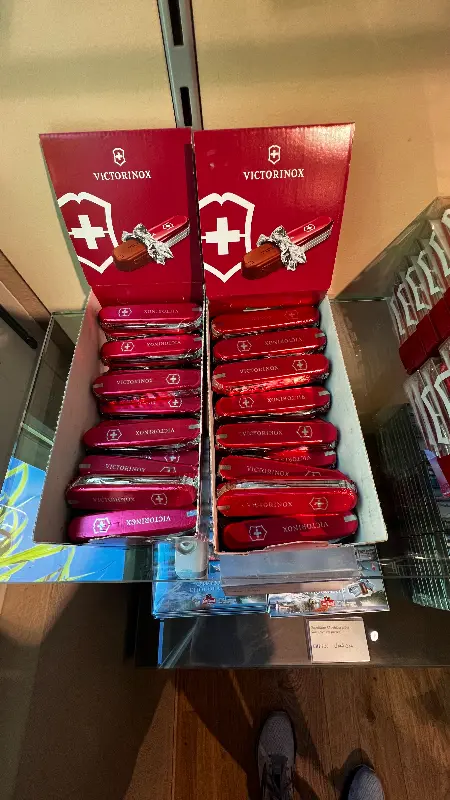 은은한 조명 아래 빛나는 초콜릿들은 하나하나 예술 작품과 같습니다. 특히 눈길을 끄는 것은 고급스러운 포장입니다. 하늘색 포장지에 금색 글씨로 새겨진 가게 이름은 초콜릿의 가치를 더욱 돋보이게 합니다. 섬세하게 묶인 리본은 선물을 받는 사람의 기쁨을 배가시킬 것입니다. 매장 한켠에는 스위스를 상징하는 빅토리녹스 칼 모양의 초콜릿도 진열되어 있어 독특한 기념품을 찾는 이들에게 좋은 선택이 될 것 같습니다. 붉은색 패키지에 담긴 초콜릿 칼은 스위스의 정통성과 초콜릿의 달콤함을 동시에 느낄 수 있게 합니다.